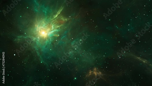 Wall mural : Space background - flying through fractal nebula in green and orange color with star field - digital a