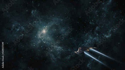 Wall mural : Space background - spaceship fly in colorful fractal blue nebula with star field - 3d rendering