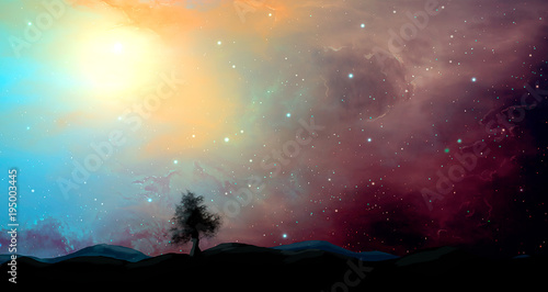 Wall mural space colorful nebula with tree and land silhouette. elements furnished by nasa. 3d rendering - Wall murals Wall mural space colorful nebula with tree and land silhouette. elements furnished by nasa. 3d rendering - Wall murals