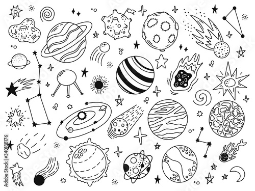 Wall mural space doodles. sketch space planets, hand drawn celestial bodies, earth, sun and moon. universe spac