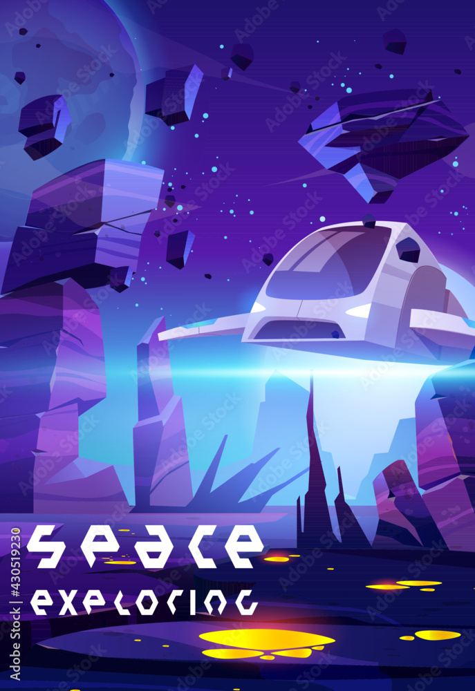 Wall mural space exploring poster with spaceship and alien planet surface. design template of explore galaxy, c