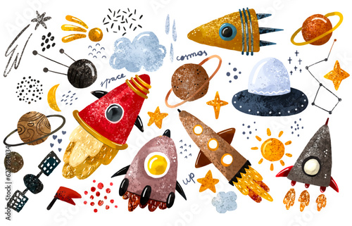 Space illustration in childish style - set of cosmos elements such as rocket, stars, asteroids, ufo, Wall mural