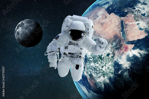 Wall mural : Space man flies in zero gravity in open space with the planet earth and the moon - space and astronau