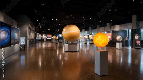 The watermark will not be included on Wall mural.: Space museum with planets of solar system and screens display data about each celestial body