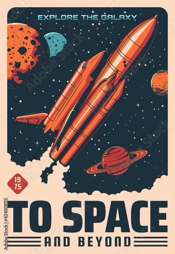 The watermark will not be included on Wall mural.: Space planets and spaceship vector design of astronomy and space travel retro poster - rocket with sh