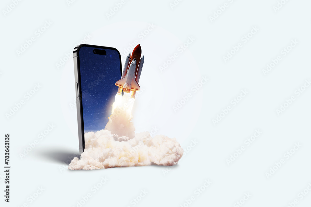 Wall mural space rocket takes off from mobile device with smoke, creative idea. application and optimization, c - Wall murals Wall mural space rocket takes off from mobile device with smoke, creative idea. application and optimization, c - Wall murals