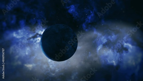 The watermark will not be included on Wall mural.: Space scence abstract dark blue alien planet exploration through outer space towards in the cloud ga