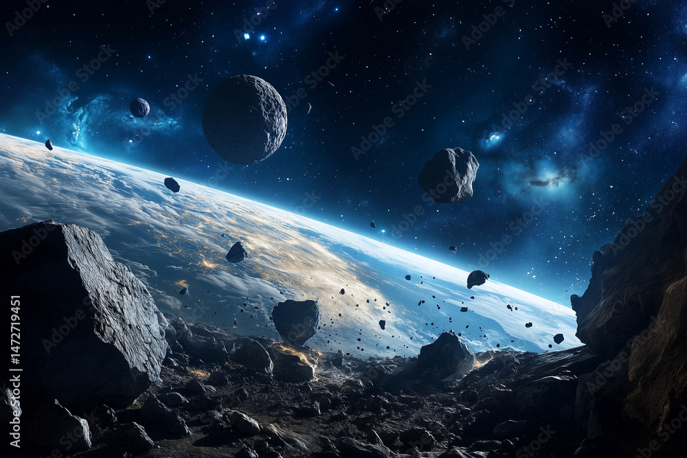 Wall mural space scene with a planet and a bunch of rocks. the rocks are scattered all over the planet and some - Wall murals Wall mural space scene with a planet and a bunch of rocks. the rocks are scattered all over the planet and some - Wall murals