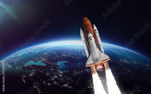 Wall mural space shuttle flight. launch in outer space from earth. rocket on orbit of the planet. spaceship and