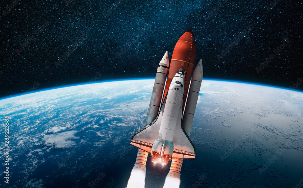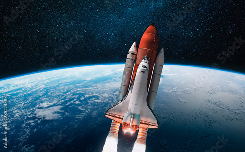 Wall mural space shuttle launch in outer space from earth. rocket on orbit of the planet. view from space stati