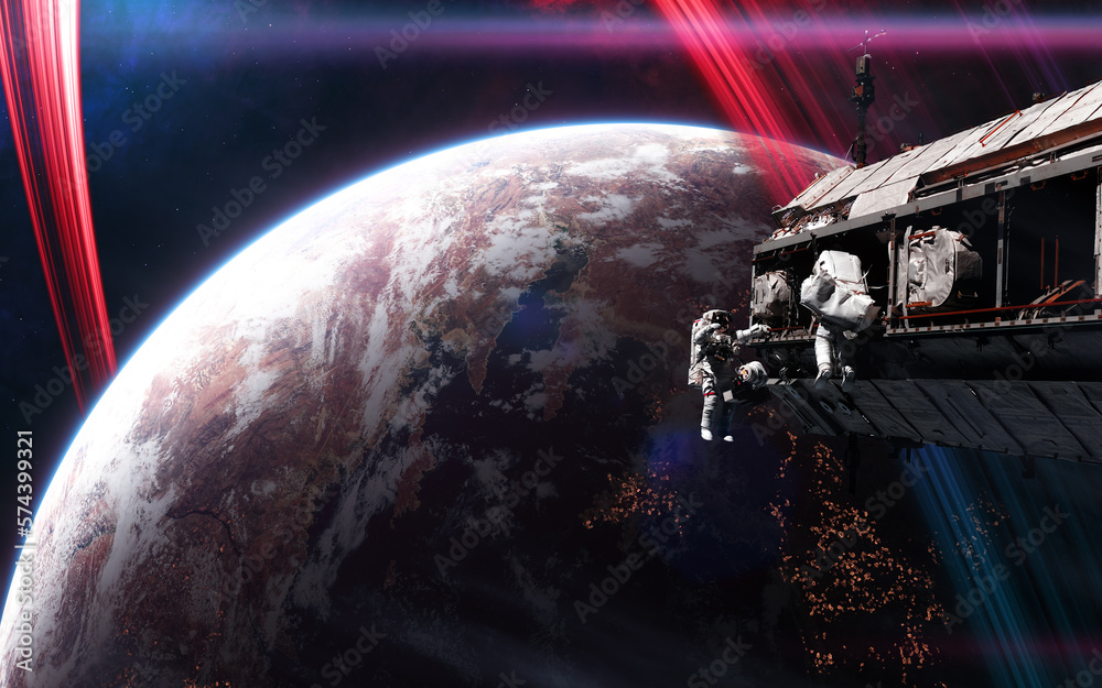 Wall mural : Space station in front of inhabited deep space planet - science fiction - elements of this image furni