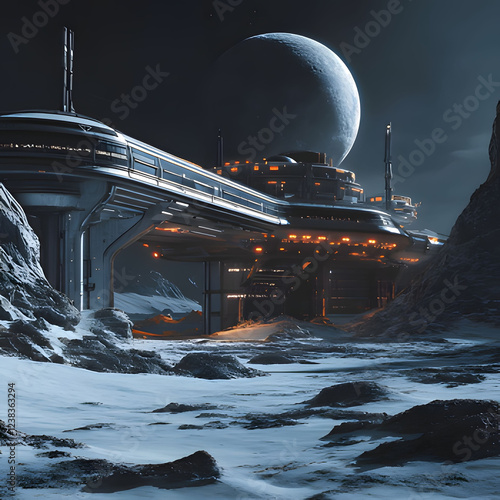 Wall mural space station on a distant moon with a large planet looming in the night sky. generative ai - Wall murals Wall mural space station on a distant moon with a large planet looming in the night sky. generative ai - Wall murals