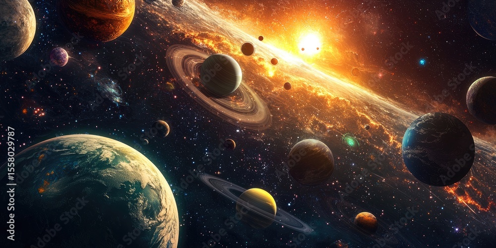 The watermark will not be included on Wall mural.: Space-themed web design featuring interactive planetary systems, glowing icons, and real-time cosmic