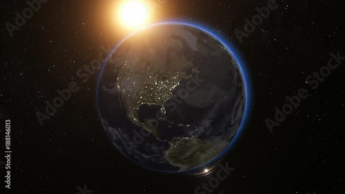 Wall mural space view on planet earth and sun star rotating on axis in black universe. seamless loop with day a