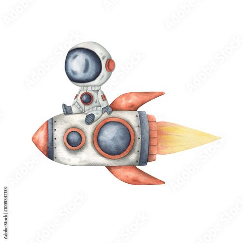 The watermark will not be included on Wall mural.: Space watercolor hand-drawn illustration with little astronaut, sits on a flying rocket - cute cartoo