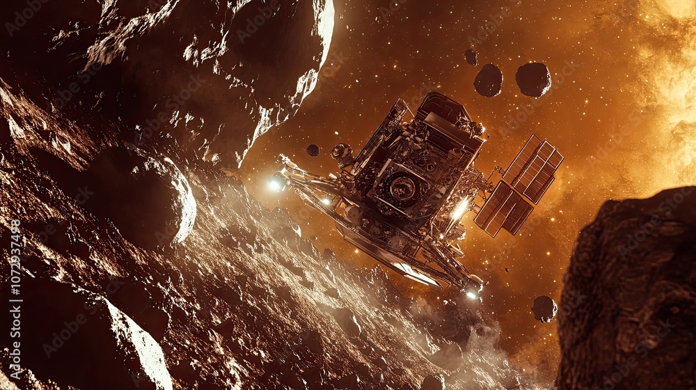 The watermark will not be included on Wall mural.: Spacecraft navigating through a field of asteroids