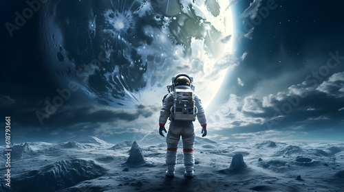 Wall mural spaceman or astronaut on the surface of moon. ai generated.