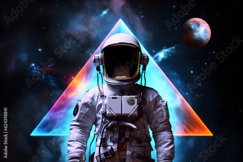 Wall mural spaceman or astronaut with triangular shape neon lights. ai generated.