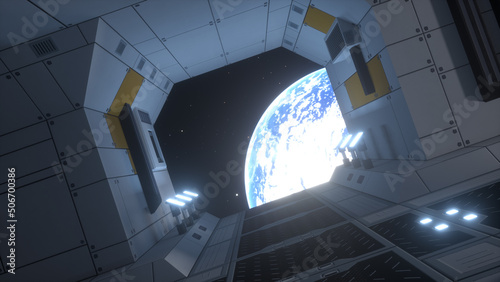 Wall mural spaceship corridor. interior of a futuristic spaceship. view of the earth. 3d rendering