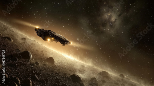 Wall mural spaceship exploring a distant asteroid belt under a vast galaxy filled with stars at twilight. gener