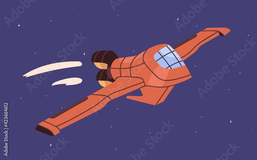 Wall mural spaceship flying in sky. intergalactic spacecraft flight in outer space. fantasy cosmic shuttle in c