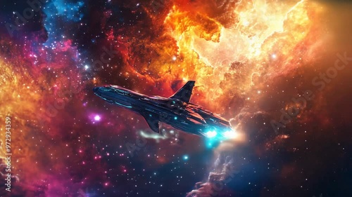 The watermark will not be included on Wall mural.: Spaceship flying through colorful interstellar clouds in space