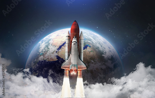 Wall mural : Spaceship in the outer space on orbit of earth planet - space shuttle in sky with clouds - continents