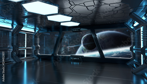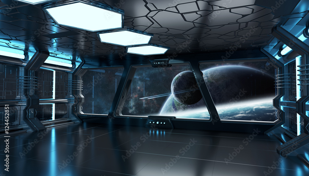 The watermark will not be included on Wall mural.: Spaceship interior with view on distant planets system 3d render