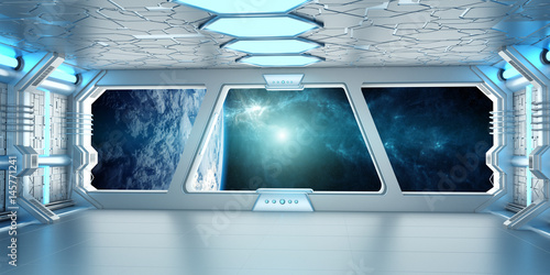 Wall mural spaceship interior with view on the planet earth 3d rendering elements of this image furnished by na