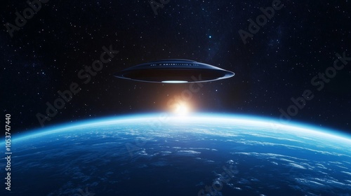 Wall mural : Spaceship soaring above a distant planet with glowing rings, stars twinkling in the background, capt