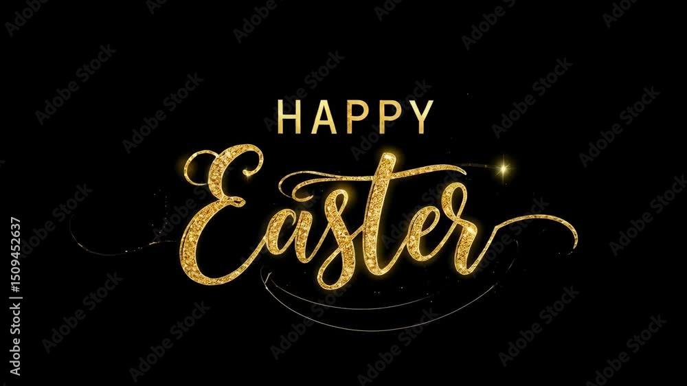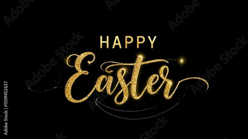 The watermark will not be included on Wall mural.: Sparkling happy easter animation on black background with light burst and golden script text for sea