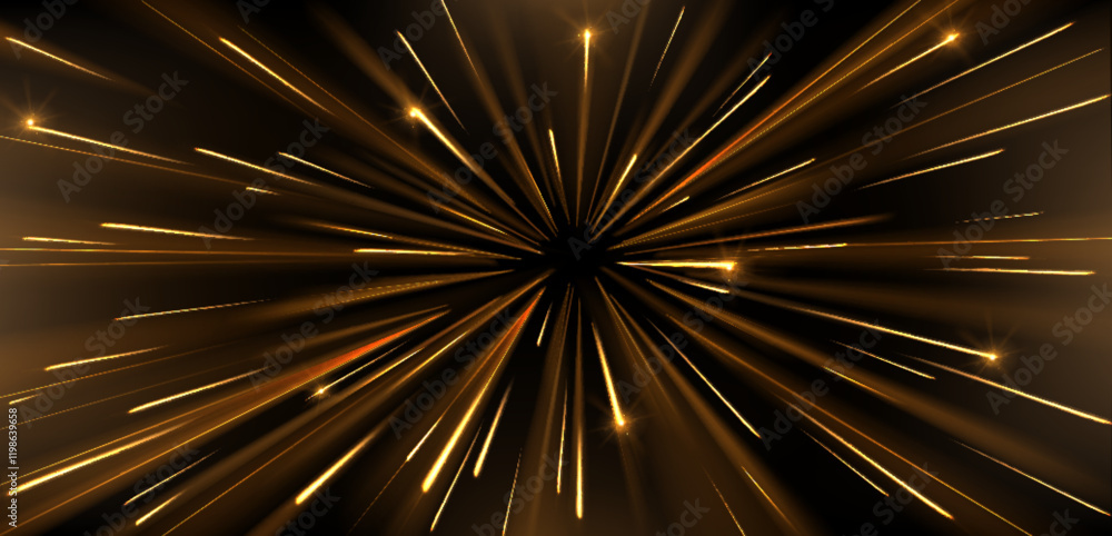 Speed light effect with radial golden glowing lines and bright sparkling particles bursting from cenWall mural
