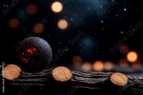 The watermark will not be included on Wall mural.: Sphere with internal illumination on wooden log with bokeh background