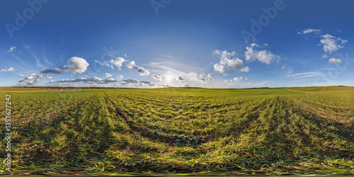 Wall mural spherical 360 hdri panorama on agro field with clouds and sun on blue sky in equirectangular seamles - Wall murals Wall mural spherical 360 hdri panorama on agro field with clouds and sun on blue sky in equirectangular seamles - Wall murals