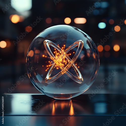 Spherical glass object with glowing core and dynamic light effects in urban evening settingWall mural