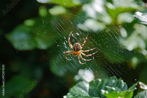 The watermark will not be included on Wall mural.: Spider spinning a web in the corner of a garden