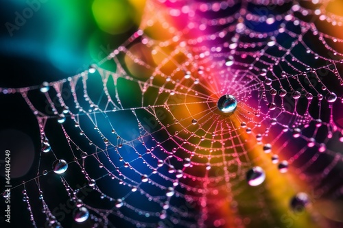 The watermark will not be included on Wall mural.: Spider web close up shot with tiny dew drops in front of vibrant colorful background -