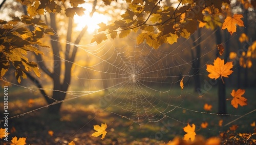 The watermark will not be included on Wall mural.: Spider web with dew drops among autumn leaves and soft sunlight filtering through trees in tranquil