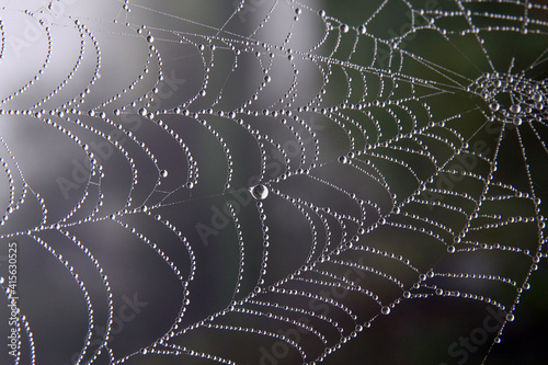 The watermark will not be included on Wall mural.: Spiderweb on natural rain background close-up - spiderweb with drops of rain pattern in dark green li
