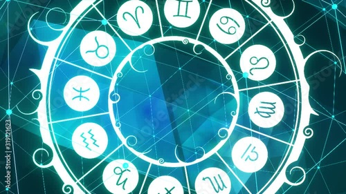 Wall mural spinning circle with astrology symbols. connected lines with dots