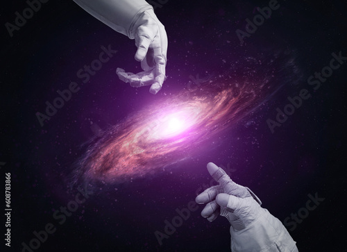 Wall mural spiral galaxy, light and hand of astronaut and robot. space energy control concept. civilization typ