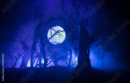 The watermark will not be included on Wall mural.: Spooky dark landscape showing silhouettes of trees in the swamp on misty night - night mysterious lan