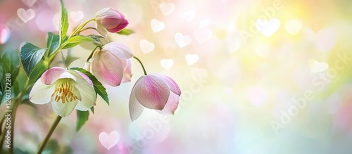 Wall mural spring hellebore flowers with soft heart bokeh background in pastel tones and selective focus for a