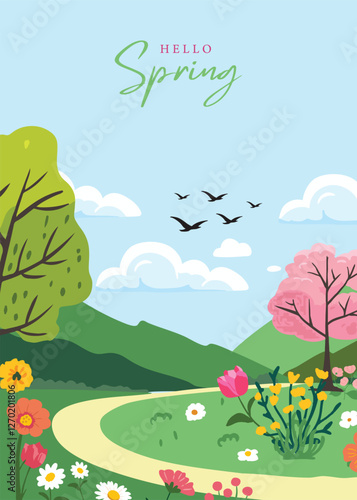 Wall mural spring landscape background with mountain and tree for a4 vertical design