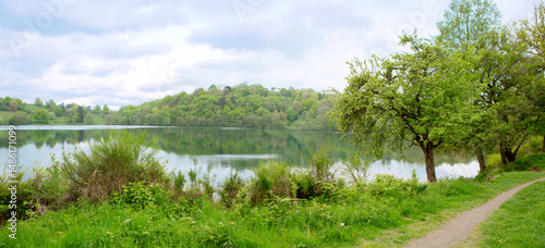 The watermark will not be included on Wall mural.: Spring morning meadow near the river with green trees on the shore -