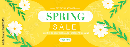 The watermark will not be included on Wall mural.: Spring sale header or banner design with get extra 40% off, flowers and leaves decorated on yellow b