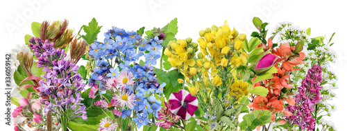 Wall mural : Spring time leaves and flowers line border macro isolated set