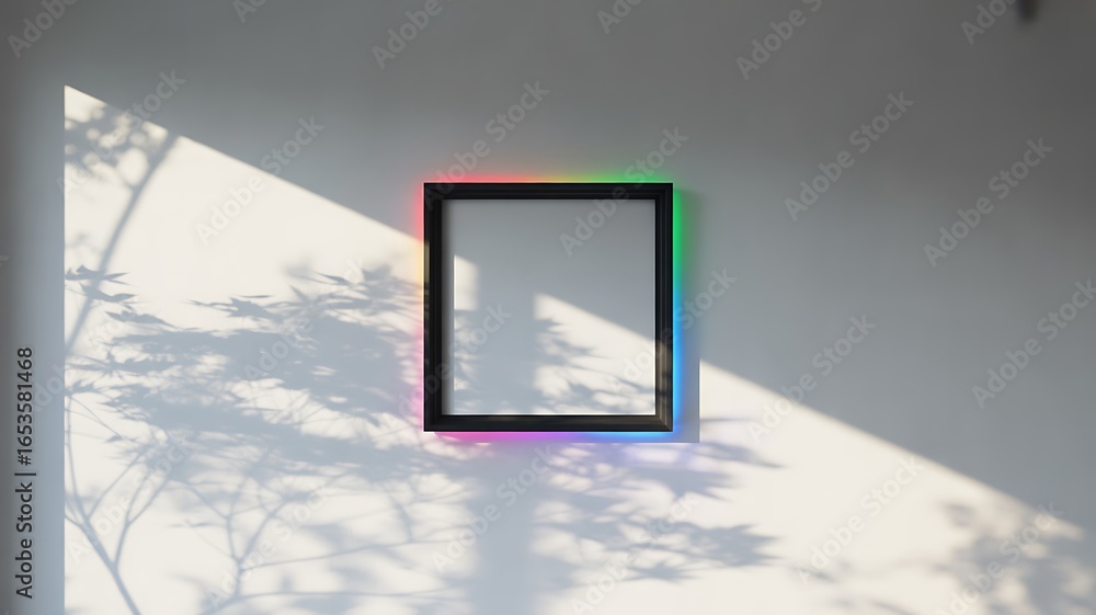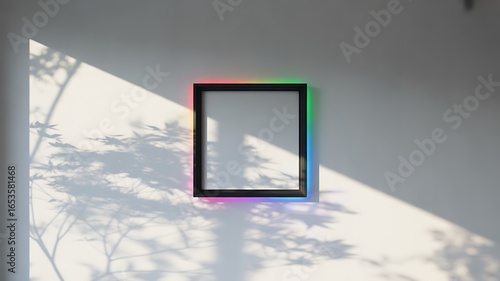 The watermark will not be included on Wall mural.: Square frame with multicolored neon edges on a shadowed wall border colorful