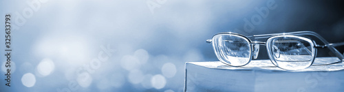 Wall mural stack of books in the library and blur bookshelf background