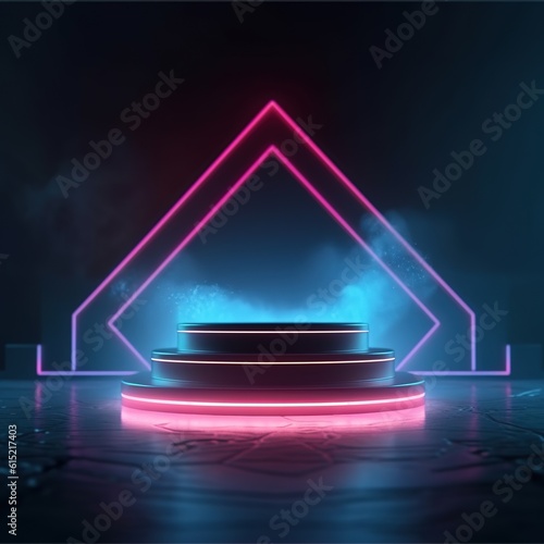 Wall mural stage with spotlight on stage. empty podium for products display with smoke and neon lights. generat